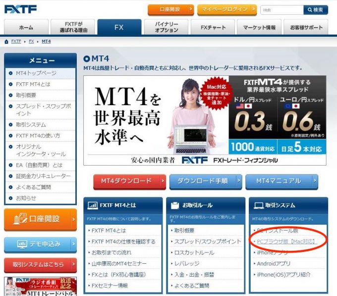 ホームのタブ、FX -> MT4 で次の画面が出てきます。