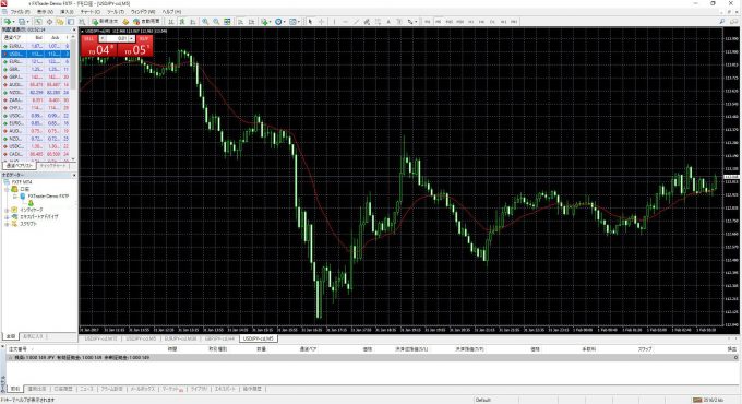 インジケーターは、記事作成時点で37種類ありました。よく使用するEMAだけ表示してみました。以下、上がPCインストール版MT4、下がブラウザ版MT4です。
