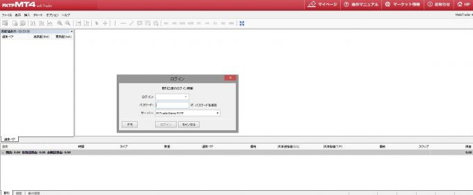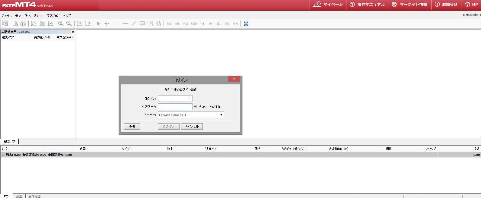 ログイン情報は、FXTF社からのメールに記載されています。ログイン情報を入力し、『ログイン』をクリックすると、ブラウザ版MT4が起動します。